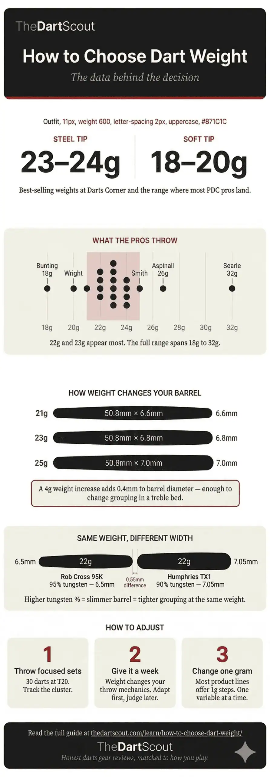 This guide works from data instead. TheDartScout pulled verified weights from 15 PDC player profiles, barrel specs from manufacturer product pages, and weight limits from competition rules. You’ll learn how weight changes a dart’s size, what the top players throw, and where the real gaps in weight advice are.
